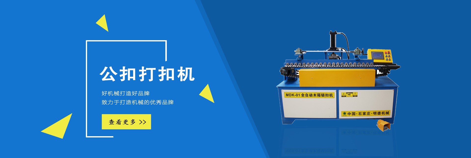 石家莊明德包裝機械有限公司是國內專業(yè)生產木全自動木箱鋼帶機、半自動公母扣木箱打扣機、全自動雙排孔定長切斷機、美式托盤打釘機械、托盤刨槽機、倒角機、木包裝箱、木托盤的生產廠家。
